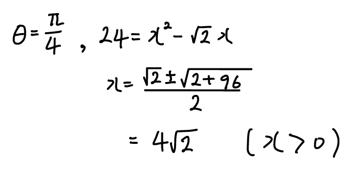 θ에 π/4를 대입하면 위와 같이 되는데 풀어내면 4√2와 -3√2가 나오게 된다. x는 길이이므로 양수이고 4√2임을 알 수 있다.