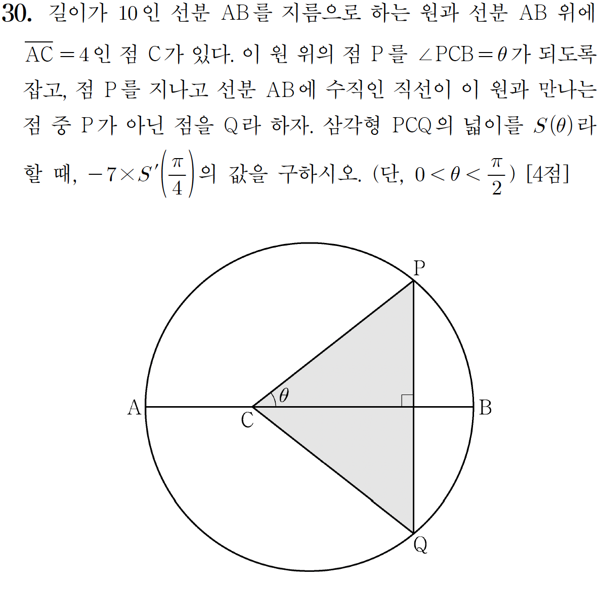 길이가 10인 선분 AB를 지름으로 하는 원과 선분 AB위에 AC=4 인 점 C가 있다. 이 원 위의 점 P를 PCB=θ가 되도록 잡고, 점 P를 지나고 선분 AB에 수직인 직선이 이 원과 만나는 점 중 P가 아닌 점을 Q라 하자. 삼각형 PCQ의 넓이를 S(θ)라 할 때, -7*S'(π/4)의 값을 구하시오.