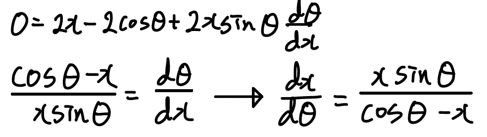 dx/dθ를 알아내기 위해 다음 식을 미분한 뒤 θ에 π/4와 x에 4√2를 대입했다. (필자는 x에 대해 미분한 뒤 뒤집어 dx/dθ를 구했다. θ로 한번에 미분해도 된다.)