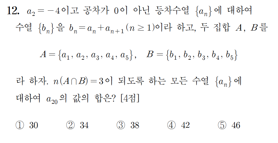 $a_2=-4$이고 공차가 $0$이 아닌 등차수열 $\{a_n\}$에 대하여 수열 $\{b_n\}$을 $b_n=a_n+a_{n+1}\,(n\geq 1)$이라 하고, 두 집합 $A,\,B$를