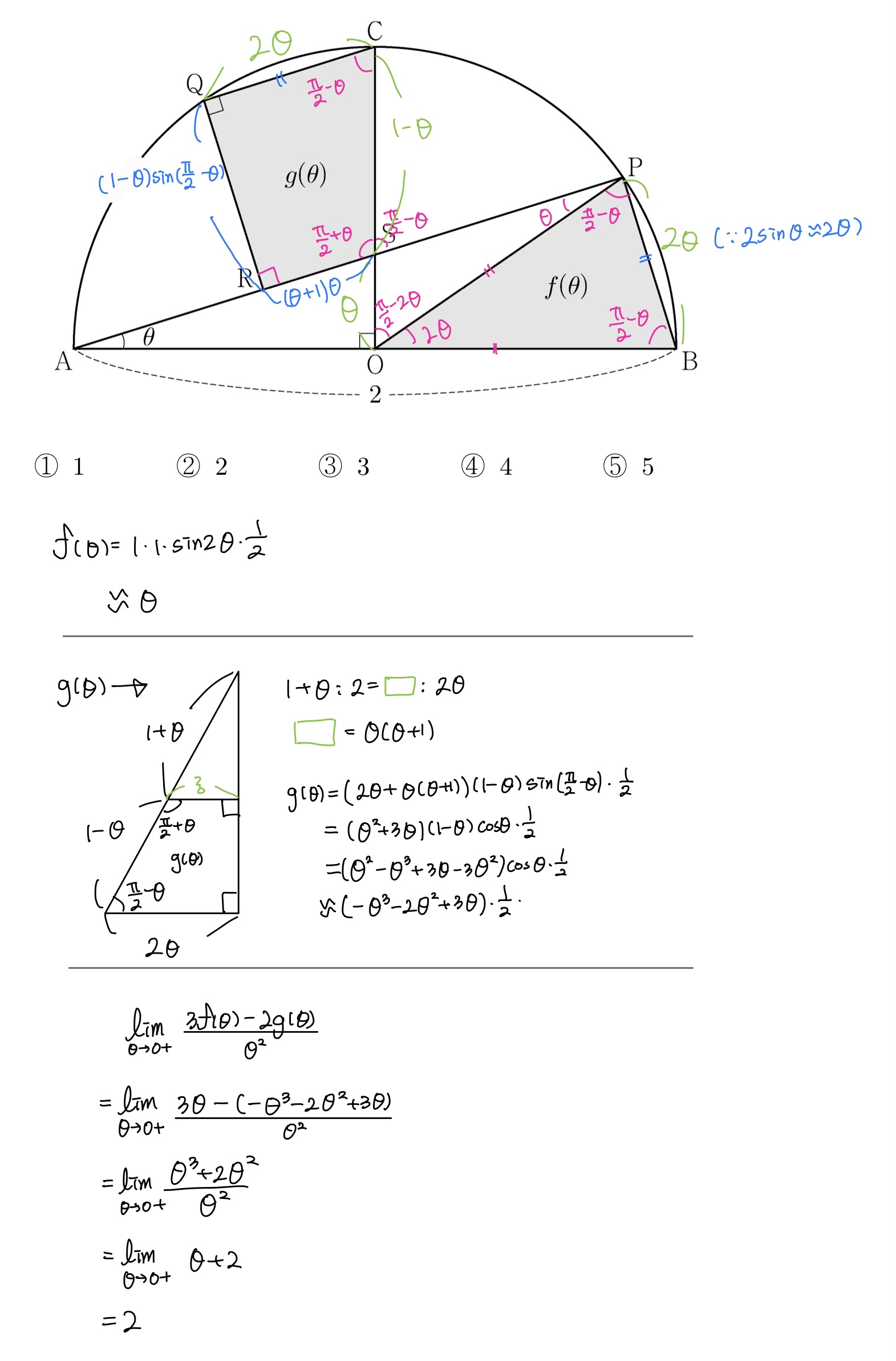 그림과 같이 중심이 O이고 길이가 2인 선분 $\overline{AB}$를 지름으로 하는 반원 위에 $\displaystyle\angle{AOC}=\frac{π}{2}$ 인 점 C가 있다. 호 BC위에 점 P와 호 CA위에 점 Q를 $\overline{PB}$ = $\overline{QC}$가 되도록 잡고, 선분 $\overline{AP}$ 위에 점 R를 $\displaystyle\angle{CQR}=\frac{\theta}{2}$가 되도록 잡는다. 선분 $\overline{AP}$와 선분 $\overline{CO}$의 교점을 S라 하자. $\angle{PAB}=\theta$일 때, 삼각형 POB의 넓이를 $f(\theta)$, 사각형 CQRS의 넓이를 $g(\theta)$라 하자.