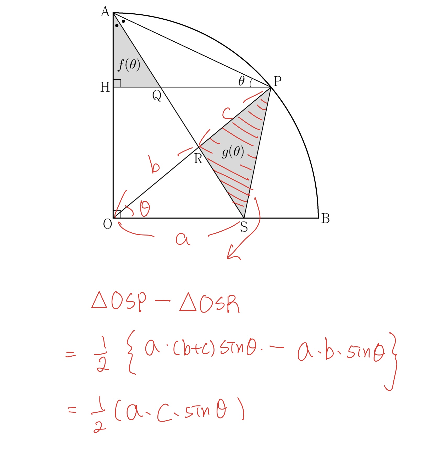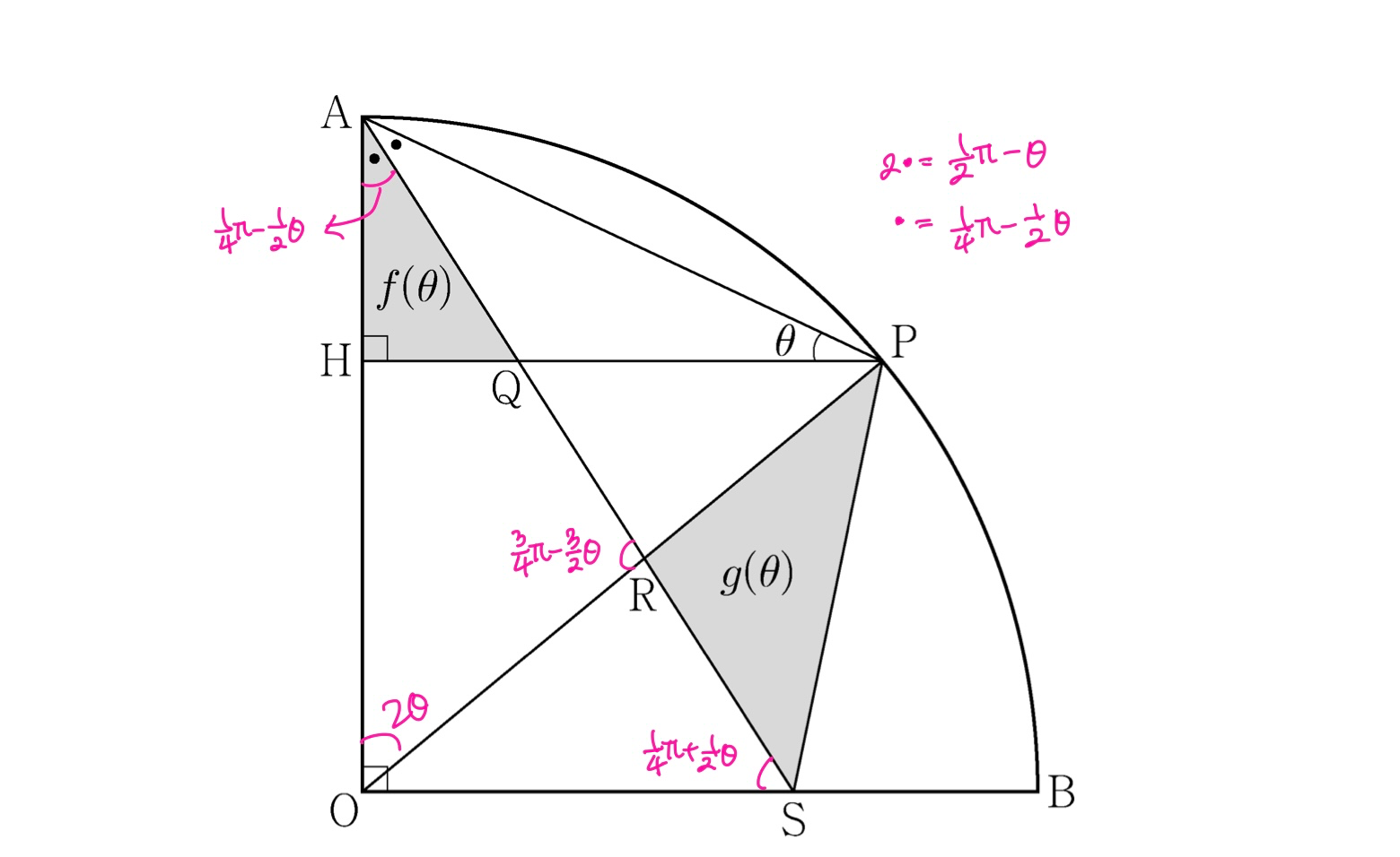 그림과 같이 반지름의 길이가 1이고 중심각의 크기가 π/2 인 부채꼴 OAB가 있다. 호 AB 위의 점 P에서 선분 OA에 내린 수선의 발을 H라 하고, ∠OAP를 이등분하는 직선과 세 선분 HP, OP, OB의 교점을 각각 Q, R, S라 하자. ∠APH= θ일 때, 삼각형 AQH의 넓이를 f(θ), 삼각형 PSR의 넓이를 g(θ) 라 하자.