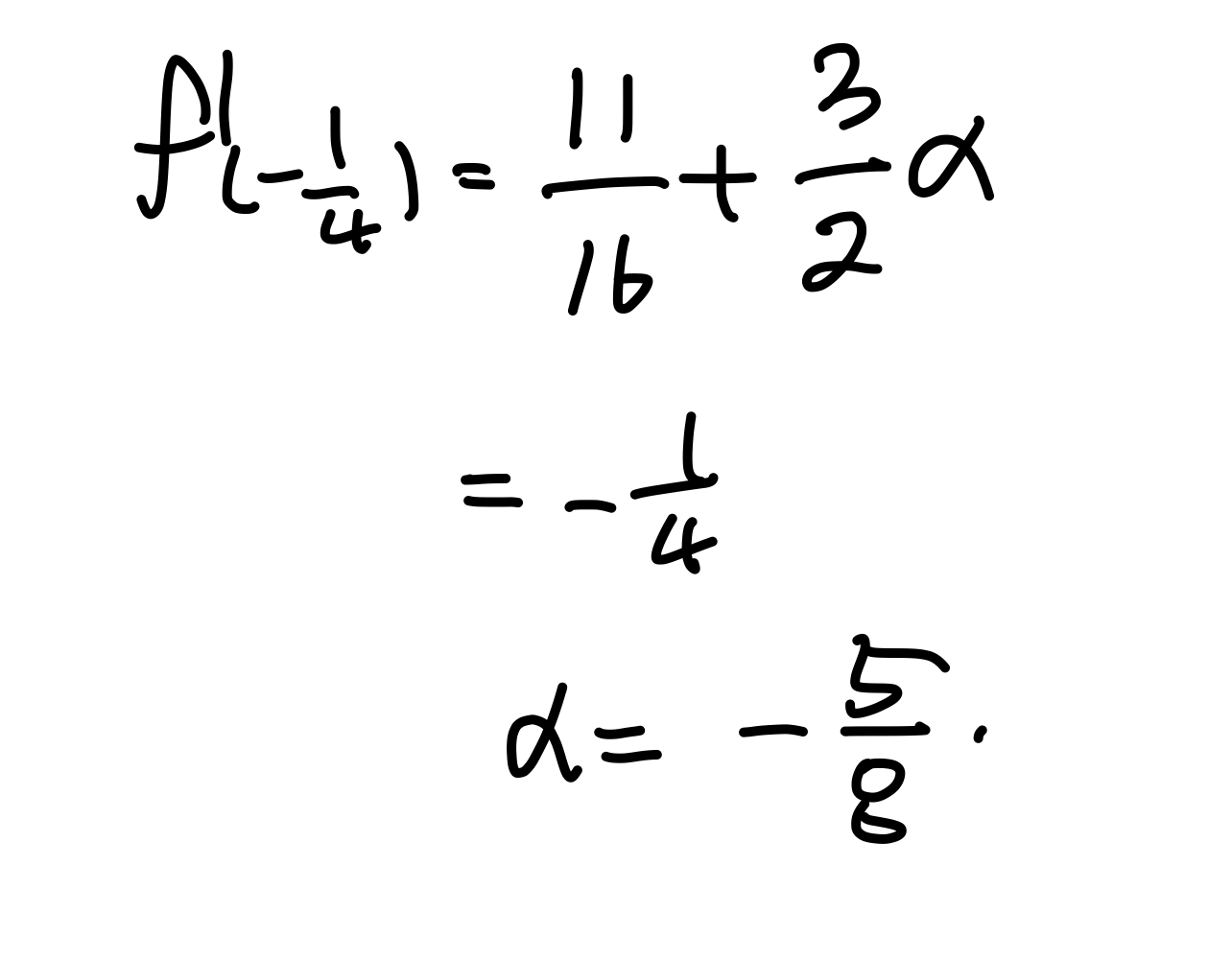 $\displaystyle{f'}\left(-\frac14\right)=-\frac14$라는 조건을 이용해 $\alpha$를 구하면, $\displaystyle\alpha=-\frac58$이다.