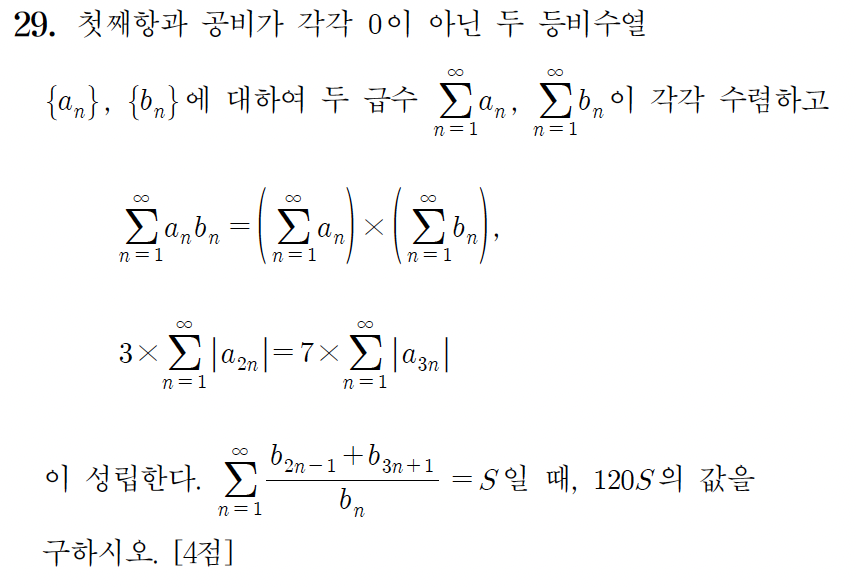 첫째항과 공비가 각각 0이 아닌 두 등비수열 ${a_n}$, ${b_n}$에 대하여 두 급수 $\displaystyle\sum_{n=1}^{\infty} a_n$, $\displaystyle\sum_{n=1}^{\infty} b_n$이 각각 수렴하고,